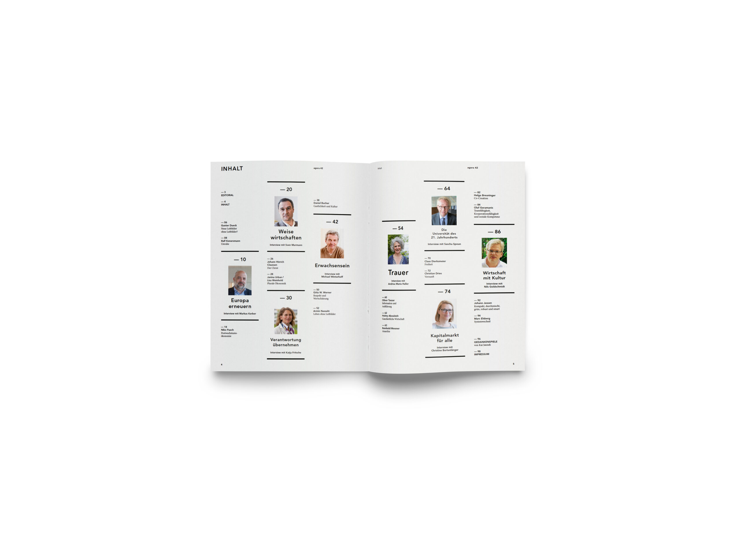 Für diese Ausgabe der agora42 haben wir außergewöhnliche Persönlichkeiten aus Wirtschaft, Philosophie, Politik, Religion, Medizin, Justiz, Kultur, Architektur, Bildung, Gastronomie… um eine Antwort gebeten. Acht Interviews und 17 Statements verwandeln diese agora42 in das, was sie ihrem Namen nach ist: einen Marktplatz, auf dem die Zukunft verhandelt wird.