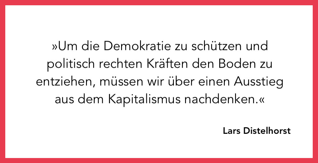 „Was sich aktuell durchsetzt, ist eine postpolitische Demokratie, die das Politische durch eine Verwaltung des Status quo ersetzt und alles Weitere vom Markt erhofft“ schreibt Lars Distelhorst, Professor für Sozialwissenschaft in Potsdam.