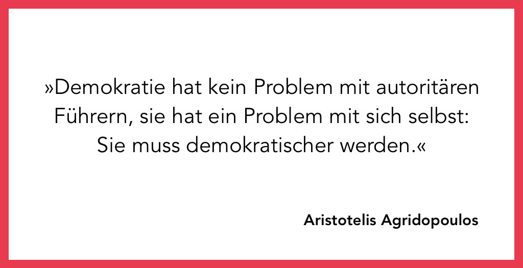 Aristotelis Agridopoulos, Politikwissenschaftler aus Heidelberg meint, dass Demokratien demokratisiert werden müssen: „Demokratie hat kein Problem mit autoritären Führern, sie hat ein Problem mit sich selbst: Sie muss demokratischer werden.“