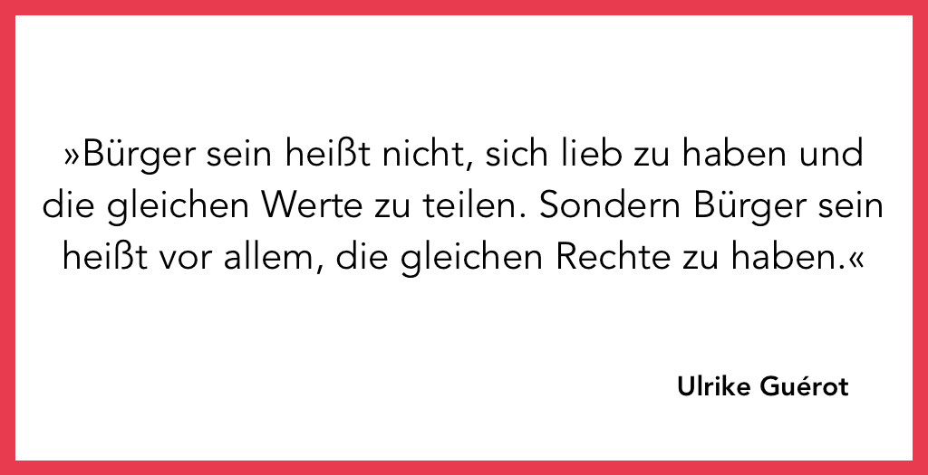Die Professorin für Europapolitik Ulrike Guérot entwirft in „Komm, wir bauen einen europäischen Staat …“ das Bild einer europäischen Bürgerunion: „Bürger sein heißt nicht, sich lieb zu haben und die gleichen Werte zu teilen. Sondern Bürger sein heißt vor allem, die gleichen Rechte zu haben.“